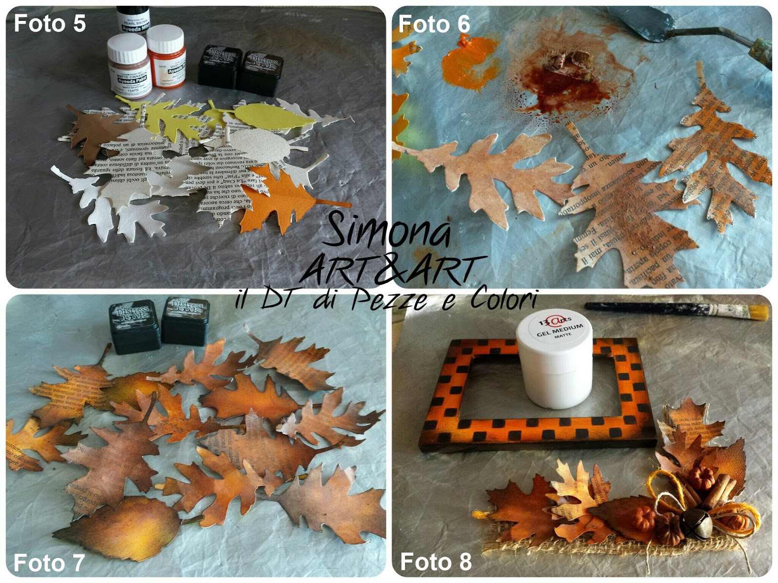 Ritagliamo o fustelliamo delle foglie usando diversi materiali, io ho usato pagine di libro, cartoncino e dei ritagli di fogli telati. (vedi Foto 5)