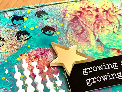 Per la seconda card, ho prima spruzzato su carta velina stropicciata delle macchie di colore alternando Dina Wakley Media Gloss Spray by Ranger, nei colori Turquoise, Lemon e Fuchsia, poi ci ho appoggiato sopra la card, raccogliendo il colore e creando un effetto a tratti marmorizzato e con toni più tenui.