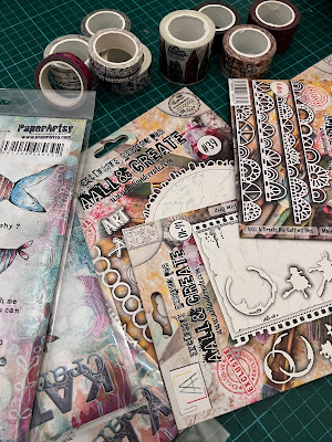 Prima di tutto, creato lo sfondo timbrando con il Pluriball, utilizzando Distress Oxide, pigmento Infusion e spray 13Arts, applicati su 3 pezzi diversi.